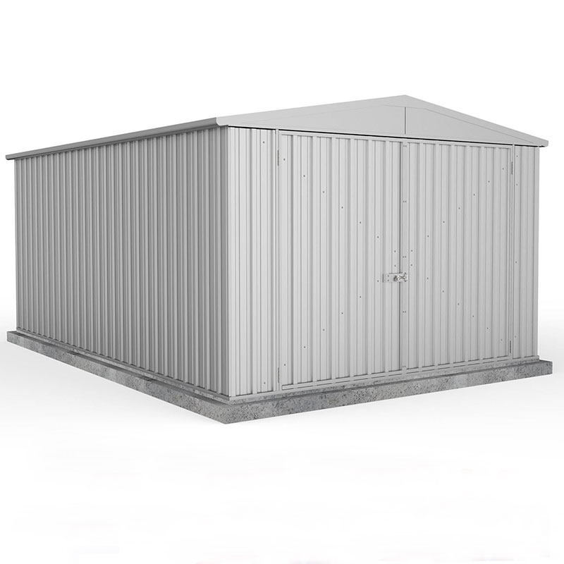 Boasting an exceptionally smart design, SNAPTiTE easy assembly and remarkable 30-year anti-rust warranty, the 10 x 15 Absco Utility Metal Garage Workshop Shed in Zinc (3m x 4.48m) is certain to meet even our most discerning customers’ requirements.This prefab garage is proudly built in Australia from Bluescope high-tensile steel, so is completely weatherproof and impervious to rust. 100% pest proof and fire retardant too, this garage building will neither blister, swell nor warp. It offers you exceptionally robust and durable garden storage, and will maintain its attractive appearance for decades to come.When anchored to a solid base, this metal workshop is wind resistant to 147kmph, so there’s no need to worry about the unpredictable British weather. The apex roof design increases headroom and makes it ideal for housing your car or taller machinery/ equipment.You can gain comfortable access to your vehicle via braced double doors. A separate single door, which can be installed either side of the structure, offers you a quicker route to any stored items at the rear of the garage. Both sets of doors include a padlock fixing (padlocks not supplied). The windowless design provides yet another layer of security, so you can rest assured that your valuable car/ machinery will remain safe from unwanted attention.The patented SNAPTiTE assembly system makes installation an absolute doddle compared to other metal garages and sheds. With 75% less screws than normal; pre-assembled, rolled-edge safety panels with pre-punched holes; and clear, illustrated assembly instructions, there’s everything you need to achieve a straightforward, stress-free assembly. To top it all, the whole garden building is maintenance-free, saving you money and leaving you more time to polish your car.Please be advised that this metal shed is designed without a floor. An anchor kit is available to buy as an optional extra, enabling you to secure the garden building to a solid, level base to ensure its stability in adverse weather conditions.You can purchase one of these superb Absco garden buildings in a range of sizes, colours and designs, so there’s sure to be one to meet your own requirements.Free delivery is available to most UK postcodes.Remarkable 30-year anti-rust warrantyPatented SNAPTiTE assembly systemProudly built in Australia, from Bluescope high-tensile steelBraced double doors and separate single door include padlock fixings (padlocks not supplied)75% less screws than a regular metal shed/ garagePre-assembled panels with rolled safety edges and pre-punched holesCompletely weatherproof, impervious to rust and maintenance freeWind resistant to 147kmph!Designed without a floor – must be secured to a solid, level surfaceThis shed should be anchored to a firm, level base â?? select the Anchor Kit from Accessories as an optional upgradeChoose from a range of colours, sizes and designsFree delivery to most UK postcodes