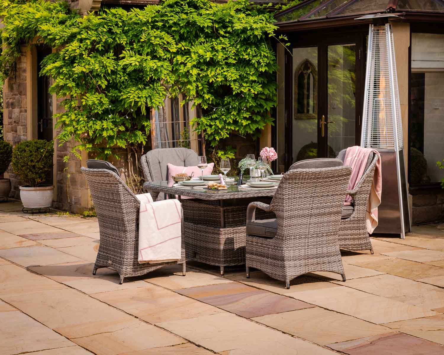 Rattan Garden Furniture at Rattan Direct – Marseille 4 Rattan Garden Chairs & Square Drinks Cooler Dining Table in Grey 4 MARSEILLE CHAIRS WITH SQUARE DRINKS COOLER DINING TABLE It’s time to dine al fresco with the Marseille range. Featuring a high cushioned backrest and seat as well as curved arms, this is a dining range that you must get your hands on. With a central drinks cooler this dining table will keep your guests’ drinks cool as they dine al fresco. The height of this table can be adjusted too, so you can switch it from a coffee to a dining table with ease. WHAT’S INCLUDED 4x Marseille Dining Chairs in Grey1x Square Drinks Cooler Dining Table in GreyFREE Outdoor Cover A STUNNING DINING SET Check out our four-seater Marseille dining set, the ideal addition to your outdoor space. The Marseille chairs bring total comfort as you sit, as a thick cushion sits on both the seat and backrest. Armrests complete the look and guarantee comfort. The chairs and table included in this set are both designed to last, as we only use durable materials to curate our furniture. We use a UV protected weave which prevents the set from fading when it sits in direct sunlight. Our lightweight aluminium frame is lightweight, so your furniture can be moved with ease. The powder coating finish makes the set rust-resistant. A TABLE FOR THE SUMMER If you’re wanting the ultimate dining table for your summer garden parties then the square drinks cooler table will be right up your street. The table is perfect when you dine outdoors throughout the summer as the centre features a large drinks cooler which will keep your drinks cool. A hole sits in the centre, so a parasol can be added. EXPLORE OUR RATTAN DIRECT RANGES