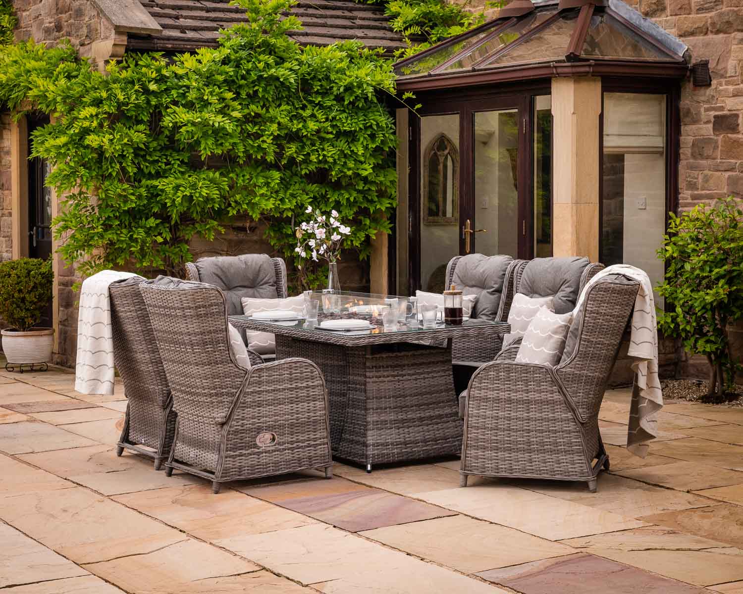 6 Reclining Rattan Garden Chairs & Rectangular Fire Pit Dining Table in Grey – Fiji – Rattan Direct