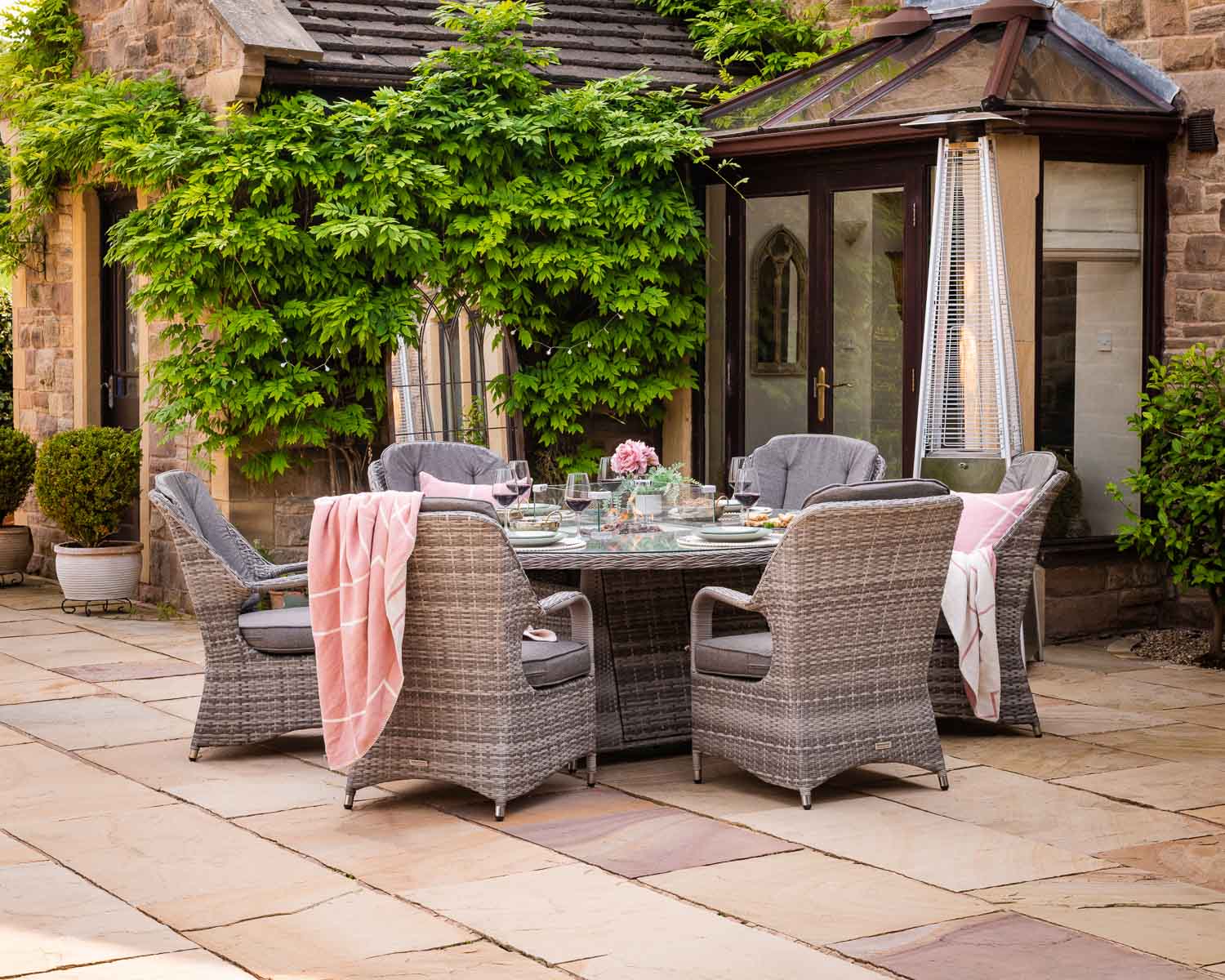 6 Seat Rattan Garden Dining Set With Large Round Table in Grey With Fire Pit – Marseille – Rattan Direct