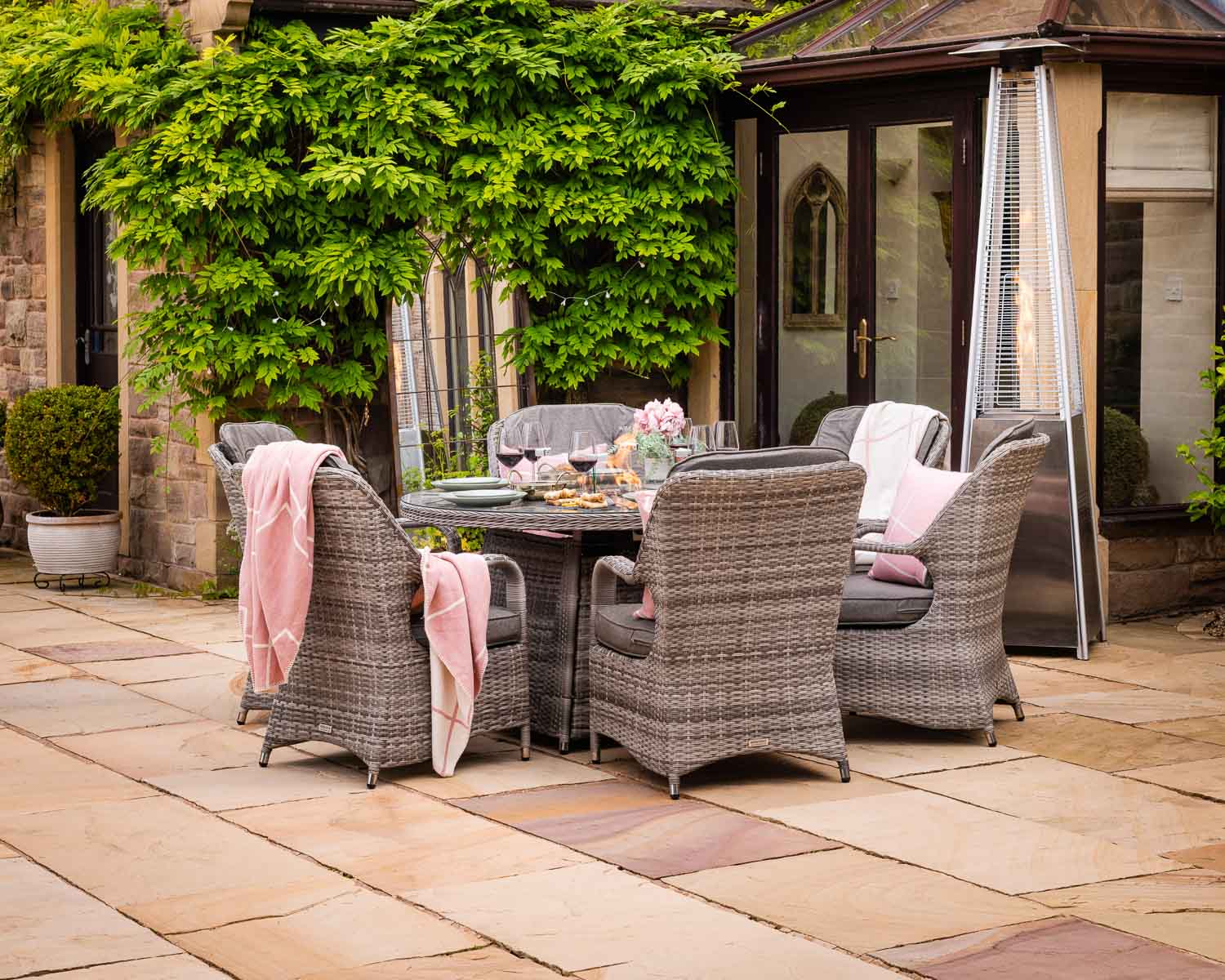 6 Seat Rattan Garden Dining Set With Round Table in Grey With Fire Pit – Marseille – Rattan Direct