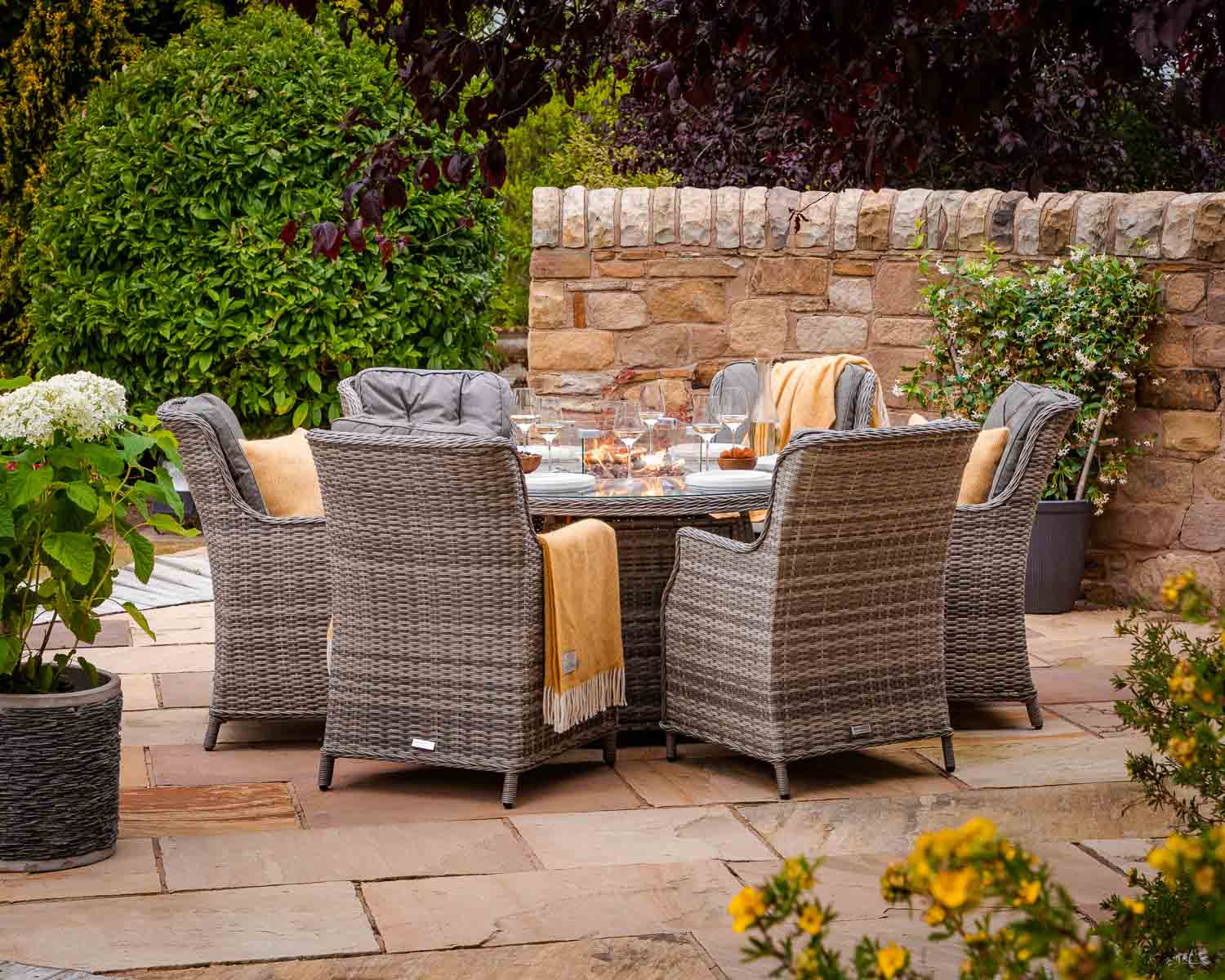 6 Seat Rattan Garden Dining Set With Round Table in Grey With Fire Pit – Riviera – Rattan Direct