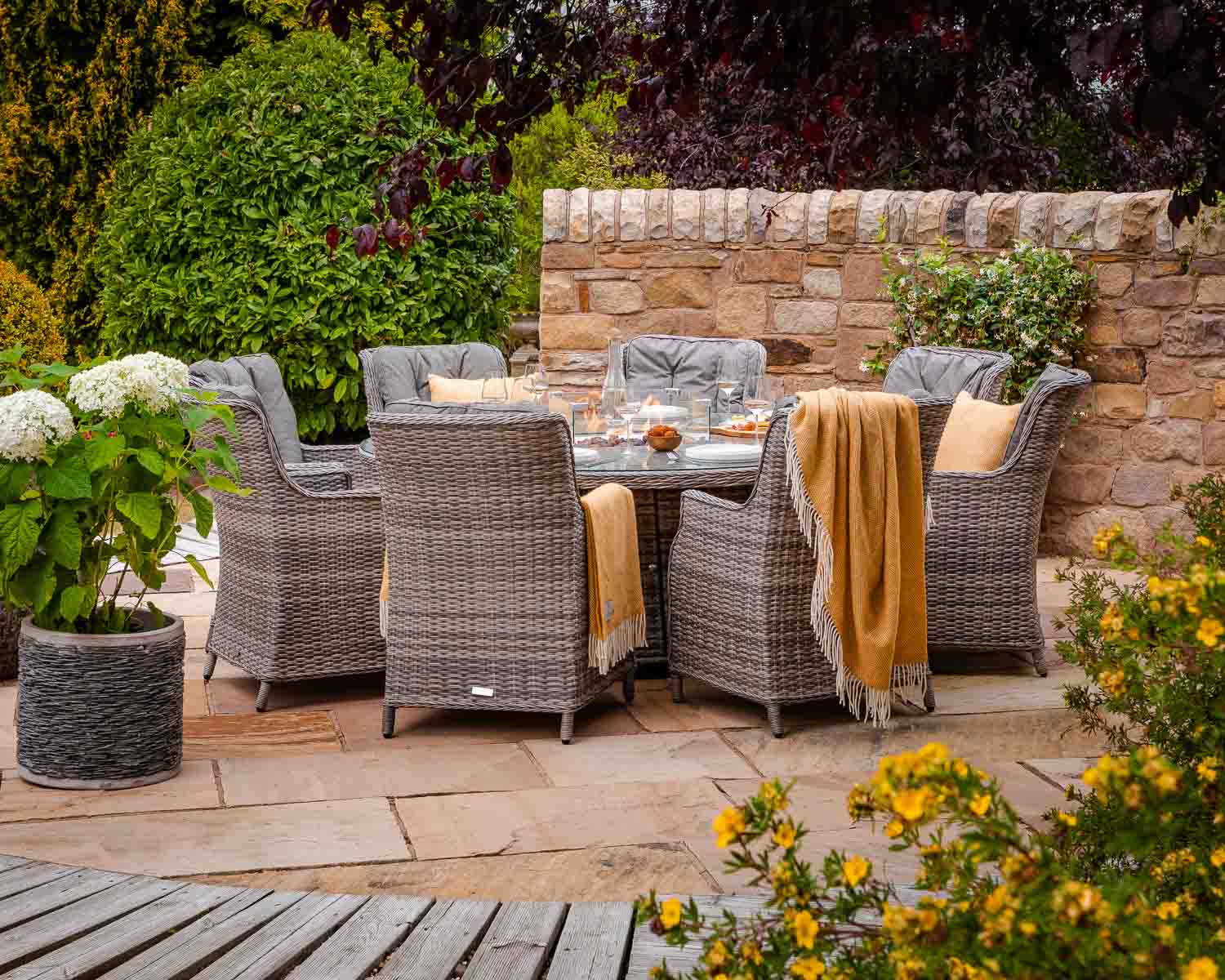 Rattan Garden Furniture at Rattan Direct – Riviera 8 Rattan Garden Chairs & Large Round Fire Pit Dining Table in Grey – Riviera 8 RIVIERA CHAIRS WITH LARGE ROUND FIREPIT DINING TABLE The Riviera collection offers total comfort for those of you who loved to dine al fresco. Featuring a thick cushioned seat and backrest that you’ll sink into as you entertain outdoors this is a range that you must get your hands on. With a fire pit table also included you can enjoy your outdoor space long into an evening. Add this set to your garden and ensure loved ones are begging for their next invite before they’ve even left. WHAT’S INCLUDED 8x Riviera Dining Chairs in Grey1x Large Round Fire Pit Dining Table in GreyFREE Outdoor CoverA 27mm clip-on regulator is supplied however this set does not include a gas canister. A propane gas canister up to 13kg is required.    DINE AL FRESCO If you’re looking for a comfortable spot to dine in your garden then the eight chairs included in this set are a perfect choice. The Riviera dining chair collection features a thick cushioned seat and backrest which you’ll sink into as you dine outdoors. Like all of our outdoor furniture, this set is made to last. With a durable rattan weave that is UV protected to prevent the grey colour from fading when it sits in direct sunlight. Beneath the weave is a lightweight aluminium frame which we protect with a powder coating, to prevent the build-up of rust. ATMOSPHERIC TOUCH GUARANTEED Light up the fire pit dining table and bring a unique look to your outdoor space. The fire pit tables are a must-have if you love to entertain outdoors, as it allows you to relax in your garden, for longer. We suggest inviting loved ones over for a summer barbeque and keeping the party going into the night. Please Note: Our gas fire pits are CE registered for safety compliance. This product must be used outdoors only. The glass guard can become hot during extended use and should be kept out of the reach of children or animals. EXPLORE OUR RATTAN DIRECT RANGES