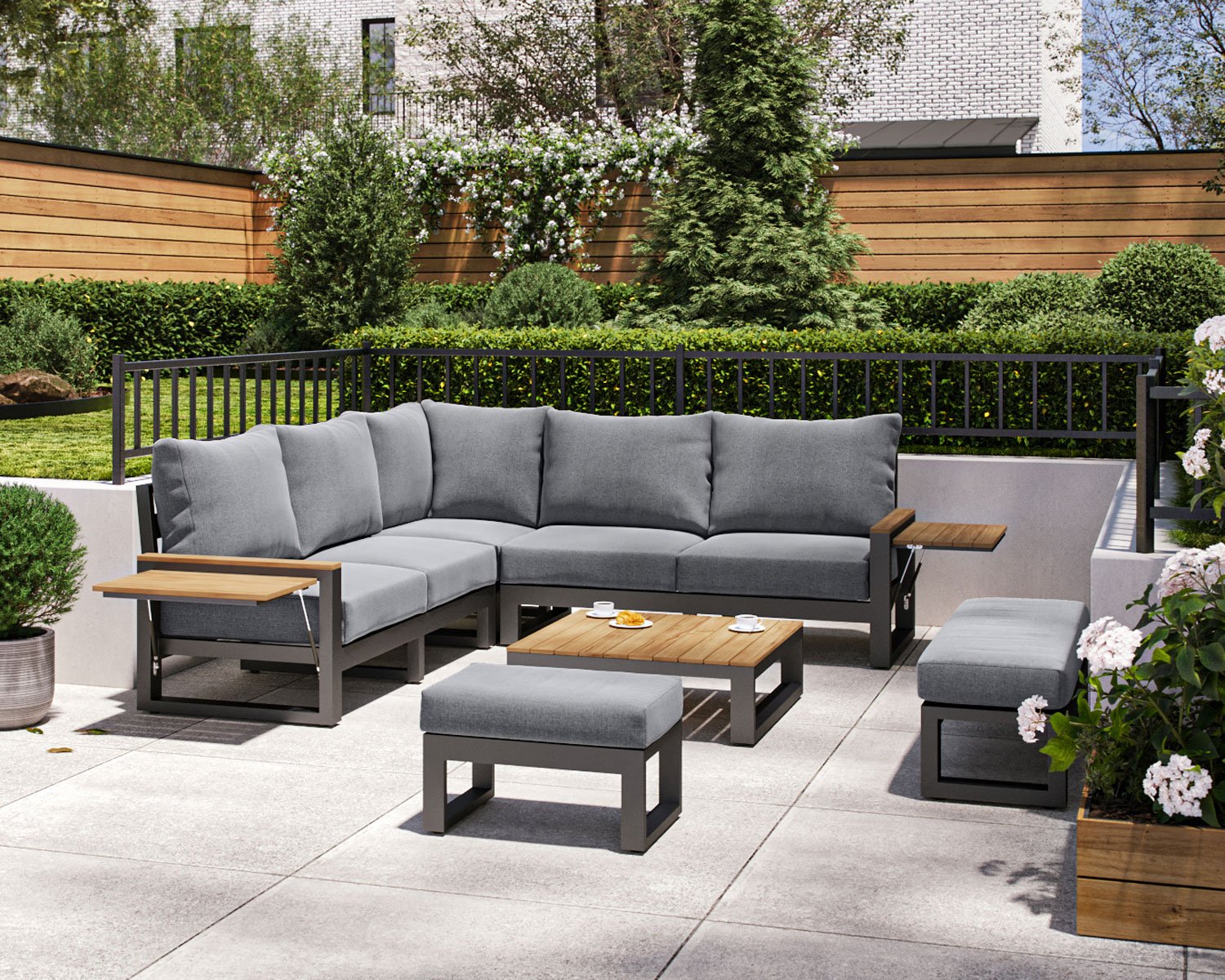 Sequoyah Aluminium & Teak Corner Sofa Set Sequoyah Aluminium and Teak Corner Sofa Set Bold, beautiful, sleek. Sequoyah is our new aluminium and teak collection that perfectly pairs the beauty of FSC-accredited natural teak wood with the bold industrial look of the aluminium frame and legs. This contemporary corner sofa set has been carefully designed to stylishly fit into any modern garden. There’s even two nifty pull-out teak side tables for convenience when lounging. The collection features solid teak across the tabletop, armrests and unique fold-away tables. The clean lines of the aluminium make this a sophisticated set that’s strong but lightweight. With deep, luxurious cushions, comfort is a big factor in this collection. Caringly designed with a specially coated weatherproof fabric this outdoor sofa can stand up to the British weather. Additionally, as teak is a natural wood, it is important to note that there may be standard colour variations. Features This ultra-modern and incredibly durable outdoor sofa design comes with a multitude of features. The weatherproof fabric is specially coated and woven to create the most durable all-weather cushions. They’re also fade-resistant due to the UV-protection that can stand the test of time. You’ll find an extremely strong and robust aluminium frame that’s powder-coated and rust-resistant. The extra thick, premium cushions make this one of our most comfortable sets. The natural teak wood is FSC accredited. Plus, there’s minimal assembly required. What’s Included 1 x Corner Sofa Set with Right-Hand & Left-Hand pull-out side tables 1 x Coffee Table 1 x Bench 1 x Stool 1 x Outdoor Protective Cover (We recommend keeping your furniture covered when not in use)