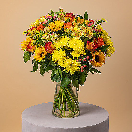Like lipstick kisses on nature’s collar, these fiery orange roses, radiant sunflowers and sun-kissed Chrysanthemums will imprint their charm on the heart of even the frostiest recipient. Delivered artistically arranged for added wow-factor, your product will arrive in an eco-friendly gel-bag to ensure freshness. Wash off the gel and cut 3cm off the stem before arranging in your chosen vase.