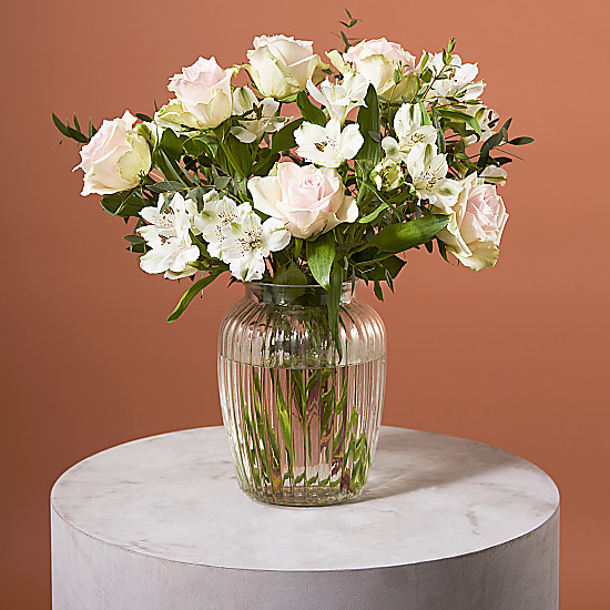 The wondrous petals of angelic white Alstroemeria form tiny wings elevating tender dusty pink roses – a sure way to add a touch of serenity to any home. Our Letterbox blooms may look a little tired after their journey, please give them up to 48 hours to perk up in a vase to look their best.