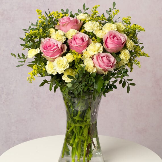 A classic bouquet featuring gorgeous pink Roses, pastel yellow Spray Carnations and Solidago with Pistachio greenery. The perfect gift for any occasion.