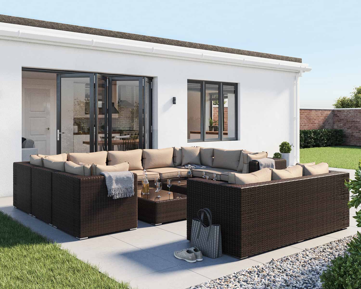 Rattan Garden Furniture at Rattan Direct – Rattan Garden Corner Sofa Set in Brown – Geneva – Rattan Direct Rattan corner sofas, luxury but affordable garden furniture. Stylish garden corner sofas made from rattan for the outdoors. Rattan Garden Corner Sofas For Outdoors Luxury Rattan Garden Outdoor Patio Furniture, Chocolate Mix and Coffee Cream. Includes: 4 x corner sections, 5 x mid sections, 2 x long ottoman/coffee tables, 1 x 3 seat sofa. Long ottomans include glass top AND cushion. Full set of FREE outdoor covers. Contemporary aluminium feet. Cushion covers showerproof, removable and machine washable. High quality resin-weave: UV-resistant, anti-fade. Strong powder-coated aluminium frame for full rust resistance. Fully assembled. Compact, flexible, stylish and quality at a superb price Dimensions (cms): Corner Sections: Width 77, Depth 77, Height 63. Mid sections: Width 65, Depth 77, Height 63. Square Ottoman/Coffee Table: Width 65, Depth 65, Height 31 (43, including cushion). Long Ottoman/Coffee Table: Width 127, Depth 65, Height 33 (43, including cushion). 3 Seat Sofa: Width 184, Depth 77, Height 67 . Garden Furniture > Rattan Garden Furniture > Rattan Garden Sofas > Rattan Garden Corner Sofas