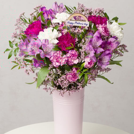 A lovely assortment of long-lasting Carnations in shades of magenta and white paired with purple Alstroemeria and delicate Limonium. The keepsake 'Happy Mother's Day' pick adds a heartfelt touch.