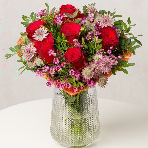 The perfect bouquet for a loved one this Valentine's Day, featuring 6 premium red Roses beautifully framed in a Sisal heart and finished with Waxflower and Astrantia. Our Roses are selected for their strength and longevity and are packed with care and use a 'water cube' to ensure they arrive in excellent condition. *This gift is pictured in full bloom. Our roses are delivered in bud so please allow a couple of days for them to fully bloom.