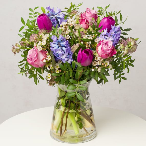 Fill your home with the scent of spring with a harmonious mix of Hyacinth blooms, delicate lilac Roses and deep purple Tulips. White Waxflower, star-shaped pink Roma and lush Pistache foliage provide the perfect finishing touch.