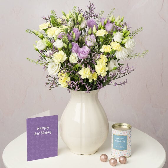 A gorgeous collection of pastel blooms featuring soft white and lavender Lisianthus, purple Limonium and clusters of buttery yellow Spray Carnations. Delivered with a 100g tub of Belgian chocolate truffles and an A6 premium birthday card – a delightful gift to make their day.