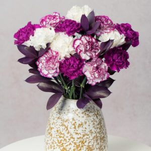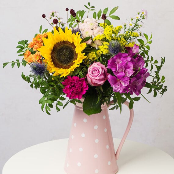 Enjoy an endless summer with a radiant assortment of blooms. Blending the golden yellow of a Sunflower with intense shades of violet Alstroemeria and a classic Rose. The vibrancy of the bouquet is beautifully balanced with delicate clusters of Aster and Solidago, while Sanguisorba Grass adds texture and height. A perfect bouquet for celebrating the magic of special moments.