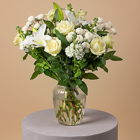 An elegant bunch of ivory coloured blooms, featuring six impressive white roses, stocks and an oriental lily wrapped in natural foliage, this bouquet will bring elegance and grace into any home. Delivered artistically arranged for added wow-factor, your product will arrive in an eco-friendly gel-bag to ensure freshness. Wash off the gel and cut 2cm off the stem before arranging in your chosen vase.