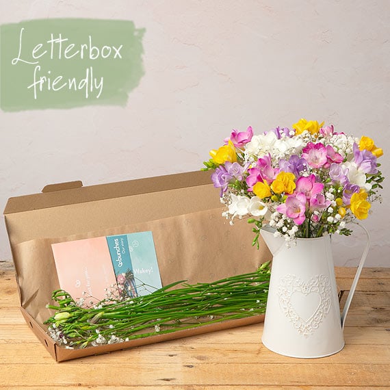 A beautiful gift of 20 mixed colour Freesias paired with Gypsophila that are sure to add a delicate floral touch to the home of your loved one. Our letterbox flower gifts are delivered in specially designed letterbox-friendly packaging and protected by fully compostable brown paper wrap, ensuring a wonderful and creative gift for the recipient.