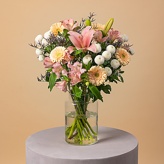 A traditional mix of cream-coloured lilies, santini, alstro and germini, finished with a spritz of purple limonium; this bouquet is a timeless classic of beauty and grace. Delivered artistically arranged for added wow-factor, your product will arrive in an eco-friendly gel-bag to ensure freshness. Wash off the gel and cut 3cm off the stem before arranging in your chosen vase.