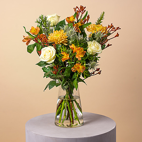 The Mellow Festival is only mellow by name – this exciting and unique bouquet features orange rossano blooms, white roses, white eryngium, orange kangaroo and orange alstro, with some pistache and sprigs of rosemary dotted around the bouquet – the perfect blend of light and bright complimented by autumnal tones. Flowers always elevate spaces around homes, but this bouquet is sure to be a complete showstopper that will be the star of any room that it is placed in. Delivered artistically arranged for added wow-factor, your product will arrive in an eco-friendly gel-bag to ensure freshness. Wash off the gel and cut 3cm off the stem before arranging in your chosen vase.