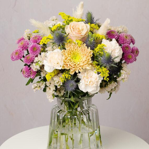 An ethereal combination of a creamy Rose, mulberry Chrysanthemums and dramatic blue Thistle. Pampas Grass adds height and a rustic texture to this enchanting bouquet of flowers. A perfect bouquet to add a touch of tranquillity to your home.
