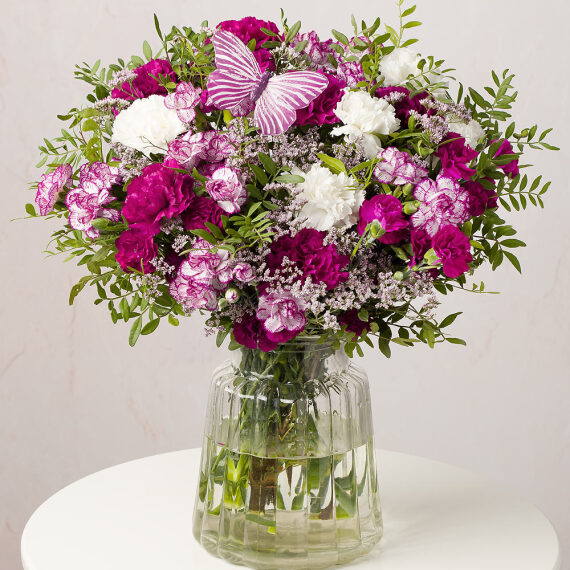 A lavish display of Carnations in shades of pink, white and purple paired with delicate Limonium and clusters of green foliage. This extra-large bouquet of blooms is sure to make a statement.