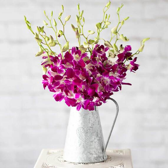 An exotic oriental bouquet of 10 long stemmed Dendrobium Orchids in a vibrant fuchsia colour.