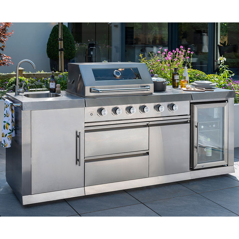 Create the ultimate alfresco dining experience with the Norfolk Grills Absolute Pro 4 Burner Luxury Gas BBQ Grill and Kitchen. Including a top-of-the-range barbecue, integral fridge and sink, this garden kitchen is exquisitely designed for people who take their BBQs seriously. Expertly constructed from aluminium and stainless steel, this top-of-the-range gas BBQ is operated by electronic ignition and comes with ergonomic controls. So, whether youâ??re a budding BBQ chef or experienced barbecue connoisseur, you can have complete confidence in cooking delicious alfresco meals. This premium BBQ grill features 4 high-powered, stainless-steel burners; an additional side burner; cast-iron, heat-retaining grills; temperature gauge; warming rack; LED lighting; part-glass hood; serving tables; tea-towel rail; storage cabinets and drawers. Wow! All you need to supply are the meats and treats. (Please note that while a rotisserie spit rod and turner can be added to this BBQ, they are not included.) Whatâ??s more, this outdoor kitchen also comes with an integral fridge and sink! The fridge is fitted with a glass door and is large enough to hold a wide range of drinks. Once your guests have left, attach a garden hose to the sink, so your spouse can wash up while you relax. A set of castors ensures youâ??ll have no problem at all manoeuvring this outdoor kitchen into secure garden storage at the end of the day. When the barbecue needs a clean, use warm, soapy water. Do not use abrasive scouring pads or oven cleaning products. This outdoor kitchen is supplied with a superb 10-year manufacturerâ??s warranty on the aluminium parts, lid, handles, shelves and cabinet. There is a 5-year warranty on the main burners, side burner and cast-iron grills, plus a 3-year warranty on the infrared burners, fridge and sink. This market-leading BBQ kitchen is available in a choice of 2 sizes. You can purchase a bespoke protective BBQ cover as an optional extra. Please be advised that a gas bottle is not included. Free delivery is available to most UK postcodes. Constructed from aluminium and stainless steel Operated by electronic ignition and ergonomic controls Features 4 high-powered burners, additional side burner, and cast-iron grills Includes temperature gauge, warming rack and LED lighting too Plus, part-glass hood, removable serving table, storage cabinet, drawers and castors Even comes with integral fridge and sink! 10-year manufacturerâ??s warranty on the aluminium parts, lid, handles, shelves and cabinet 3 to 5-year warranties on the burners, cast-iron grills, fridge and sink Choose from 2 sizes Gas bottle not supplied Purchase a tailormade protective cover as an optional upgrade Free delivery to most UK postcodes