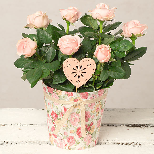 This pretty pink Rose plant is delivered in bud in a vintage-style floral pot cover complete with a heart-shaped pick. A gorgeous gift sure to make their day bloom. Please note – Rose Shade and Heart pick may vary slightly from image. This plant measures approximately: W14cm x H30cm