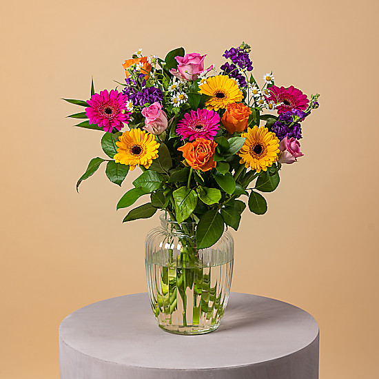Featuring a playful mix of brightly-coloured germini stocks and roses, dotted with natural foliage; this bouquet is a burst of sunshine no matter the weather. Delivered artistically arranged for added wow-factor, your product will arrive in an eco-friendly gel-bag to ensure freshness. Wash off the gel and cut 3cm off the stem before arranging in your chosen vase.