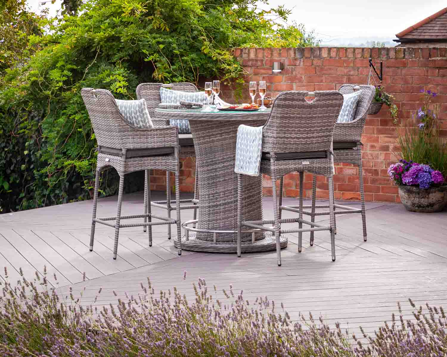 Porto Rattan Garden Bar Set with 4 Stools in Grey PORTO BAR SET WITH 4 BAR STOOLS IN GREY Take your outdoor entertainment to the next level with the Porto Rattan Garden Bar Set with 6 Stools in Grey! This stunning set is sure to turn heads as you and your guests enjoy conversations in style. Sink into comfortable bar stools and make yourself at home in this chic setting. And if those sunny days have you wishing you could stay outside for a bit longer, just use the included parasol stand designed to fit our market parasol for instant protection from UV rays. Don’t let rising temperatures be the end of your outdoor fun, go ahead and upgrade to the Porto! WHAT’S INCLUDED 4x Porto Bar Stools in Grey1x Porto Bar Table in GreyIntegrated Ice BucketFREE Outdoor Cover BAR STOOL SET The four-seater Porto bar set in grey will give your outdoor space a unique and elevated look. It features a UV-resistant grey rattan weave that won’t fade when it’s sat in direct sunlight. Our Porto sets also feature a lightweight aluminium frame which allows it to be moved hassle-free. This frame is also rust-resistant as we finish it with a powder coating, so it won’t deteriorate when wet. The four bar stools are raised so you can sit comfortably at the bar table. Each one features a cushioned seat which guarantees comfort. And the base of the stools allows you to rest your feet. INTEGRATED ICE BUCKET Our favourite thing about this table? The center of the table features a built-in ice bucket. Simply pop the lid off, pour in your ice and you can keep your bottles nice and cool as you entertain friends and family throughout the Summer. The hole in the centre of the bucket allows you to easily add a garden parasol, when the sun becomes a little too hot.