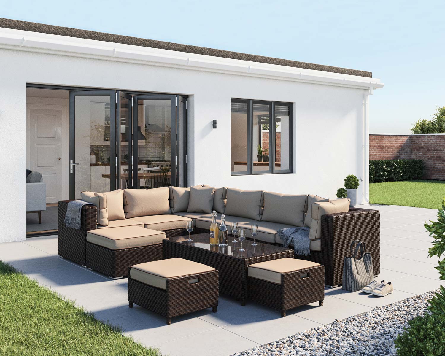 Rattan Garden Corner Sofa Set in Brown & Cream – Geneva 10 Piece – Rattan Direct