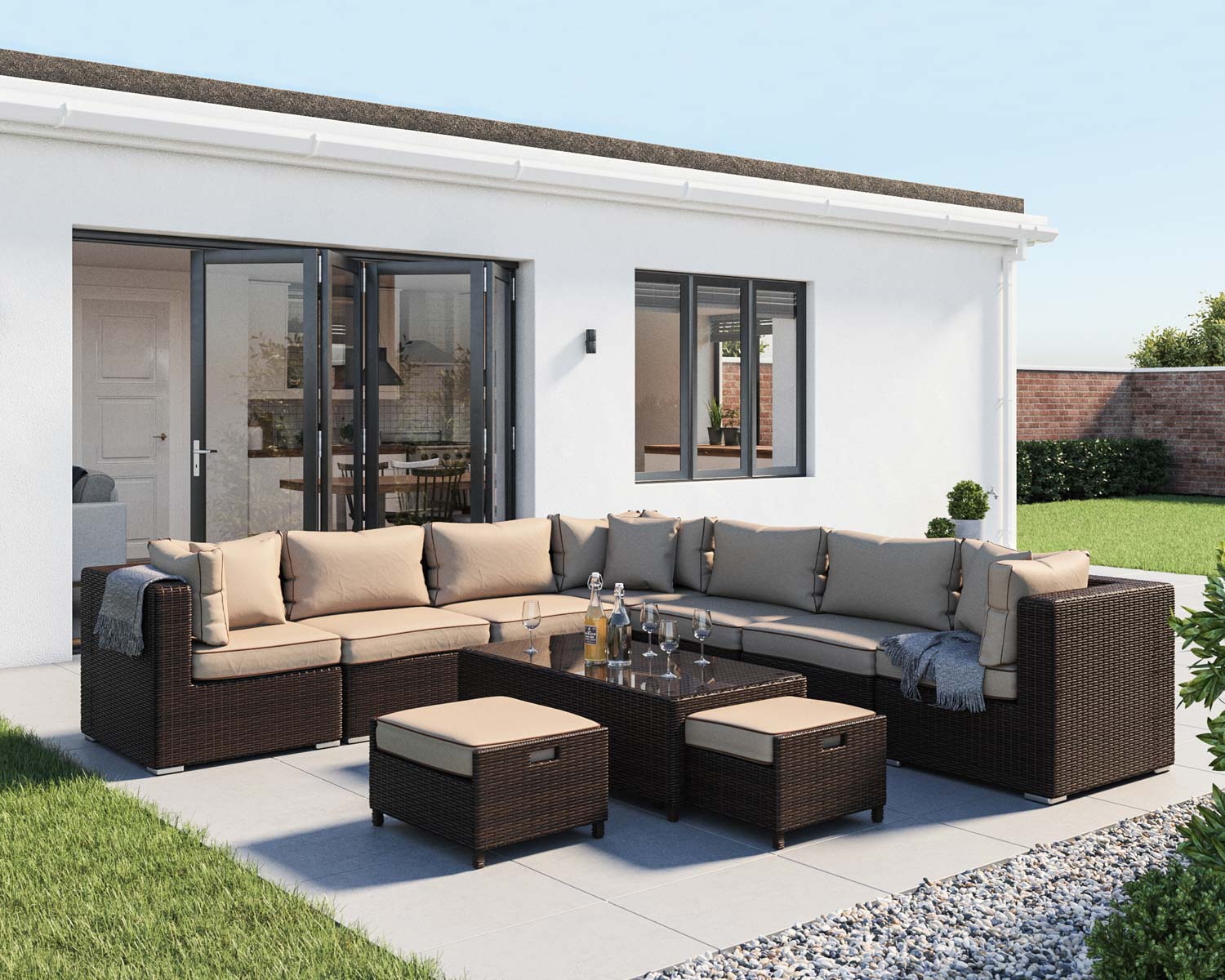 Rattan Garden Corner Sofa Set in Brown & Cream – Geneva 11 Piece – Rattan Direct