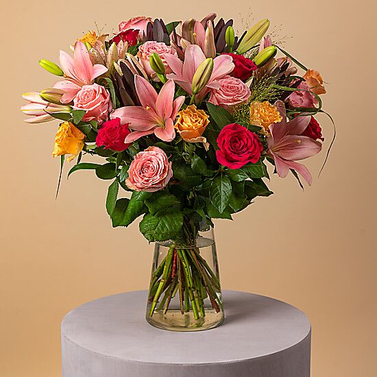 A decadent collection of roses and lilies complimented by tonal green foliage; this beautiful bouquet brings a touch of summer to the table whatever the season. Delivered artistically arranged for added wow-factor, your product will arrive in an eco-friendly gel-bag to ensure freshness. Wash off the gel and cut 3cm off the stem before arranging in your chosen vase.