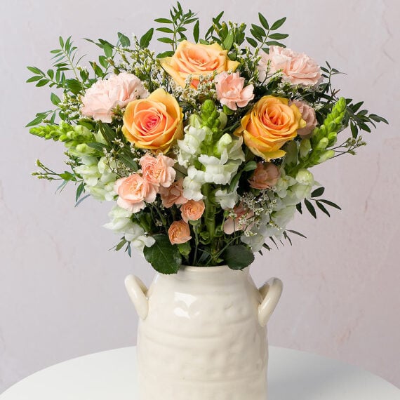 An elegant collection of peach Roses and Carnations with complementing white Snapdragon. White Limonium and delicate Pistachio leaf complete this luxurious display.