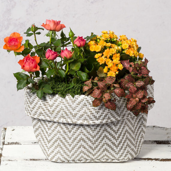 This chic woven planter is sure to brighten the home of a loved one. Featuring a miniature orange Rose plant, Kalanchoe, Nerve plant and Starry Spike-Moss. Measurements approximately (Including pot) – H x 26cm W x 28cm