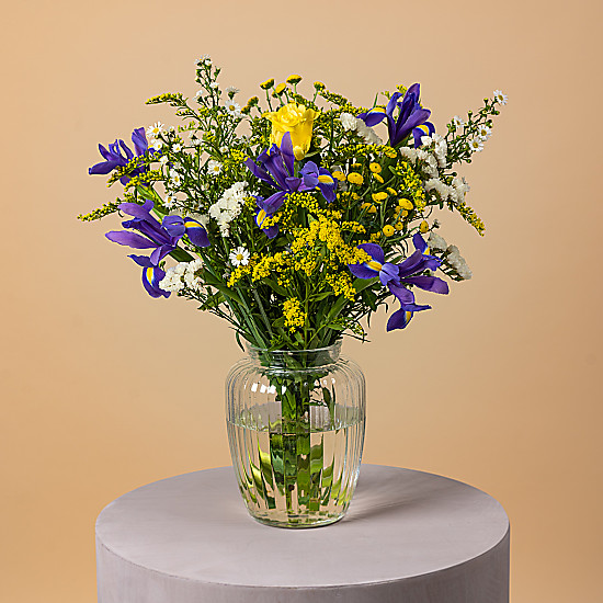 Teeming with iris, statice, September flowers, solidago and a show-stopping rose; this bouquet evokes the joy of wandering through a fragrant meadow on a bright summer’s day. Our Letterbox blooms may look a little tired after their journey, please give them up to 48 hours to perk up in a vase to look their best.