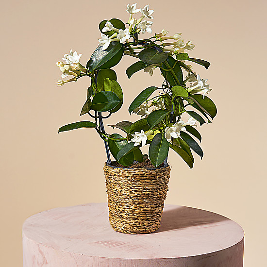 A beautiful trail of scented delights. This potted Stephanotis plant has stunning white flowers accompanied by its glossy evergreen leaves. A perfect gift that will leave the home smelling wonderful for several weeks. The plant comes in a seagrass pot with a total height of 35-40cm.