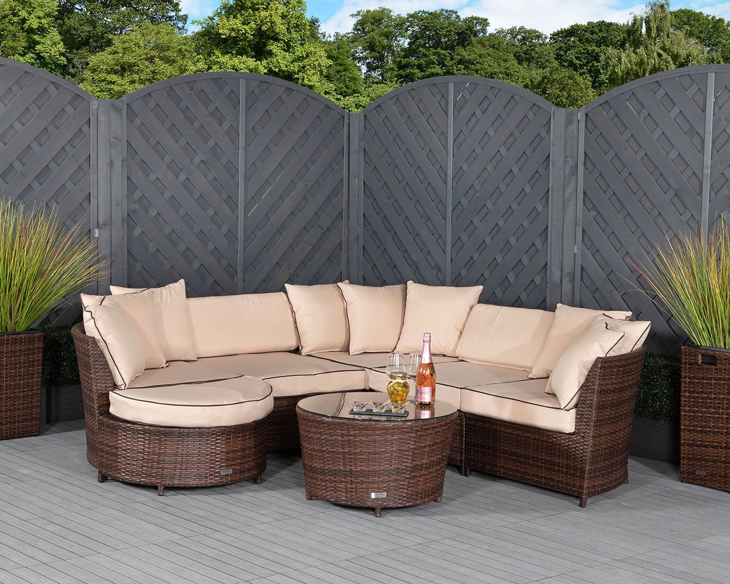 Rattan Garden Furniture at Rattan Direct – Valencia Rattan Garden Corner Sofa Set in Brown – Rattan Direct Rattan corner sofas, luxury but affordable garden furniture. Stylish garden corner sofas made from rattan for the outdoors. Rattan Garden Corner Sofas For Outdoors Luxury Rattan Garden Outdoor Patio Furniture, Dimensions (cms): Corner Sections W78 D78 H69, Mid Sections W70 D78 H69, Individual Ottoman W79 D65, H31, Individual Table W70 D70 H42. . Warranty: 7-Year Structural Warranty . A Contemporary Corner Sofa Set. The Valencia corner sofa set has been beautifully designed by the skilled in house team to perfectly complement your home décor or garden design. Made to the highest standards, this stylish set is an all in one solution to relaxing and socializing indoors or out thanks to its versatile design. The pieces all come separate, so you can arrange them in the style that best suits your needs, and with the flexible ottoman which can be used as a footstool or as part of a chaise, it offers additional seating for an unexpected guest.. Hard Wearing and Resistant to Weather . While this chocolate corner sofa set is ideal for indoor use, it can just as easily be used outdoors on the patio in all weathers thanks to its weather resistant design. UV and anti fade resistant, this set comes with a free outdoor weather cover to protect it from the rain or snow, and as it also has a powder coated lightweight aluminium frame, it’s resistant to rust and so can be left outside both winter and summer for a more convenient outdoor solution.. Easy Care Chocolate Corner Sofa. This corner sofa comes fully assembled for the convenience of the buyer, and as it is delivered speedily to any UK address you can be enjoying relaxing and dining outdoors sooner than ever. A low maintenance synthetic rattan base in attractive chocolate mix is paired with beautiful showerproof coffee cream cushions with removable covers for machine washing and an attractive look, while the inclusive coffee table with its safety glass top adds the perfect final touch to the entire set.. Garden Furniture > Rattan Garden Furniture > Rattan Garden Sofas > Rattan Garden Corner Sofas