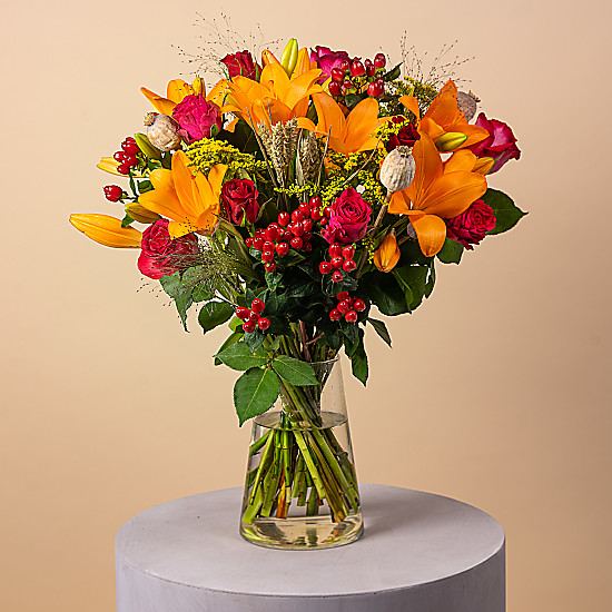 Wild Harvest captures the magic of Autumn in a vase with its vibrant colours and natural textures. With a blend of orange lilies, cerise and red roses, red hypericum, solidaster, fountain grass, wheat, and poppy heads it makes the perfect gift for a loved one at this time of year. Celebrate the warmth and beauty of this season with this handcrafted masterpiece. Delivered artistically arranged for added wow-factor, your product will arrive in an eco-friendly gel-bag to ensure freshness. Wash off the gel and cut 3cm off the stem before arranging in your chosen vase.